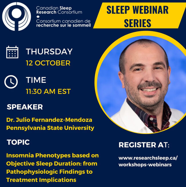 Dear Canadian Sleep Society members, The Canadian Sleep Research Consortium is launching a new series of free webinars on sleep for healthcare providers, researchers, and students. Join them on October 12, 2023 to learn about insomnia phenotypes with Dr Fernandez-Mendoza from Penn State University. More information here: www.researchsleep.ca/workshops-webinars