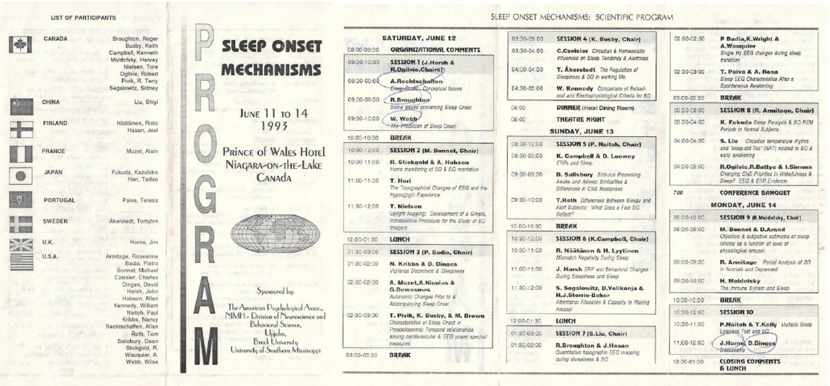 Another career highlight took place in 1993, when Bob and colleague John Harsh organized an APA book conference on Sleep Onset Mechanisms that was held in Niagara-on-the-Lake, Ontario. An impressive group of international sleep researchers gathered from nine different countries (see conference program below). The group later published their chapters in the book, Sleep Onset: Normal and Abnormal Processes (2).