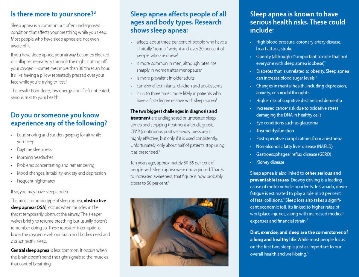 Sleep apnea is a common but often undiagnosed condition that affects your breathing while you sleep. Most people who have sleep apnea are not even aware of it. If left untreated, however, sleep apnea can have serious effects on physical and mental health and well-being. Find out more and help raise awareness about sleep apnea with this information sheet about sleep apnea.